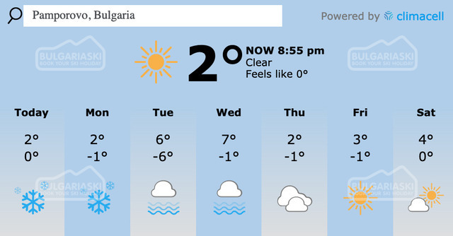 Коллектив SkiBulgaria.ru предлагает Вам узнать прогноз погоды на горнолыжном курорте Пампорово и в горах Родопы в Болгарии.... Еще